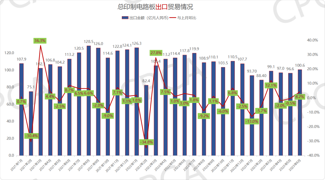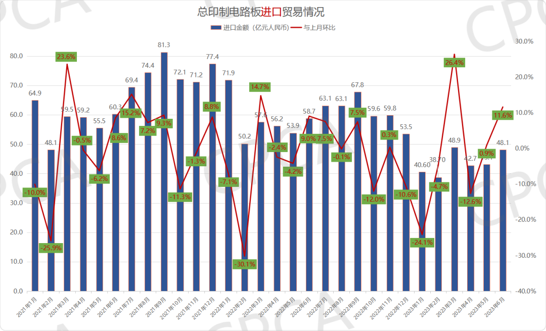 图1 2021年1月-2023年6月中国印制电路板进出口贸易情况(按月)